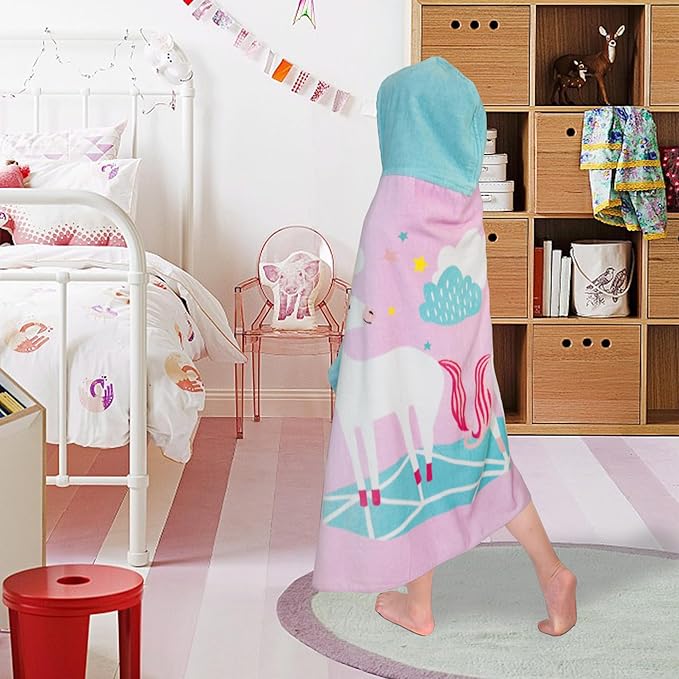 Kids Bath Towel Hooded - Cotton Kids Beach Towel 30"x50" for Ages 3 to 10, Toddler Towels with Hood Snaps, Soft Terry Poncho Towel as Pool Swim Cover Ups for Girls Boys (Unicorn Pink)