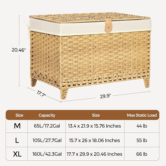 - [Spacious and Versatile] With a generous capacity of 42.3 gallons (160L), this ample storage bin is perfect for various purposes: alongside the sofa for pillows & blankets, in the bedroom for laundry, or in the closet for storing clothes. It can also serve as a storage trunk in a kids' room.