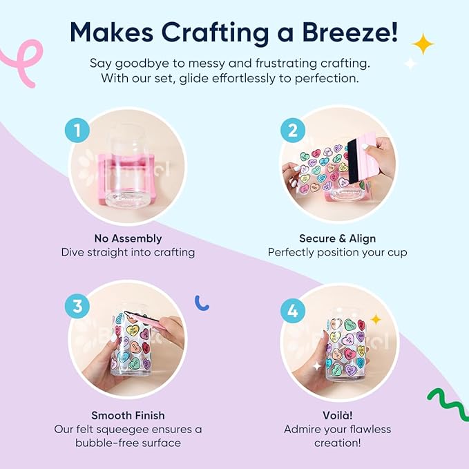 - Easy to Use: The steps of making crafts by using cup cradle set is simple:1. Place the prepared tumblers horizontally or vertically on the cradle. 2. Align the decals in correct position. 3.Squeeze out the air bubbles by attached felt squeeze. 4. Your DIY project is finishesd!