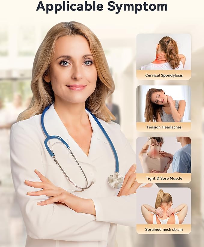 - Heated Neck Brace for Pain Relief :Our heated neck brace consists of a soft foam neck brace and a removable heating pad, when used together, it not only provides support, but its heating pad also generates heat and warms up the back of your neck to reduce joint stiffness, increase blood flow, and relieve the tightness of your neck after a long day's labor.