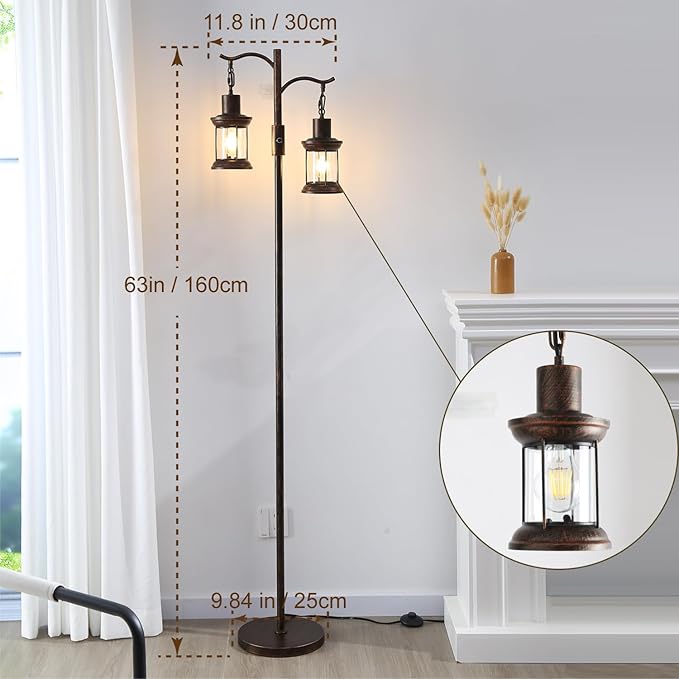 - 【Elegant Minimalist and Classical Appearance】The vintage Dimming floor lamp Illuminate your space in classic style. 63'' vintage tall pole lamp is crafted of solid metal frame, it is an ideal choice for your home with the convenient matching footswitch. This rustic standing lamp with Lantern lampshade is a great present for parents or friends.You can also choose different wattage E26 Dimming bulbs for the living room lamps according to your need (Max.40W).