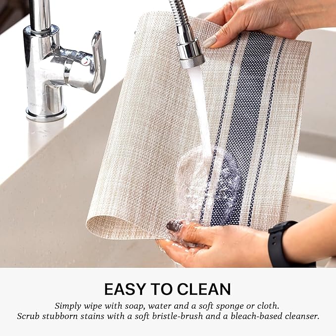 - EASY TO CLEAN:The washable placemats can be washed repeatedly.How to clean the place mats for kitchen table:Simply wipe with soap,water and a soft sponge or cloth.Scrub stubborn stains with a soft bristle-brush and a bleach-based cleanse.