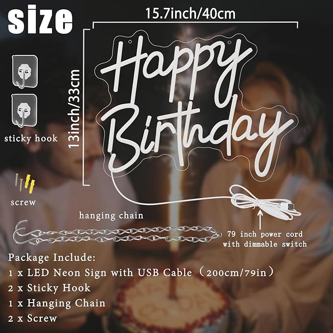 - 【Happy Birthday Neon Sign】Nothing says Happy Birthday like a warm white/pink/white LED neon sign! Hang the Neon Happy Birthday sign up as a backdrop for birthday party decorations instead of a paper Happy Birthday banner. Add an ultra bright pop to get the party going. Our party decor are the perfect size to make a stylish statement in any room.