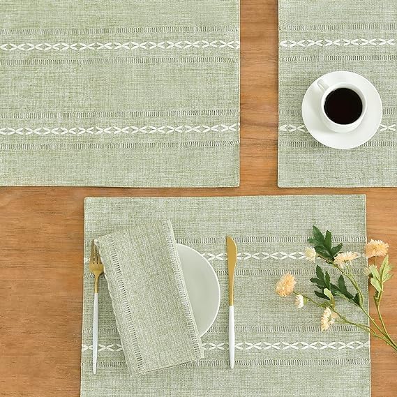 Wracra Cotton Linen Placemats, 12 x 18 Inch Set of 6 Placemats Rustic Hemstitch Place Mats for Kitchen Table and Heat Resistant-Hemstitch Sage Green