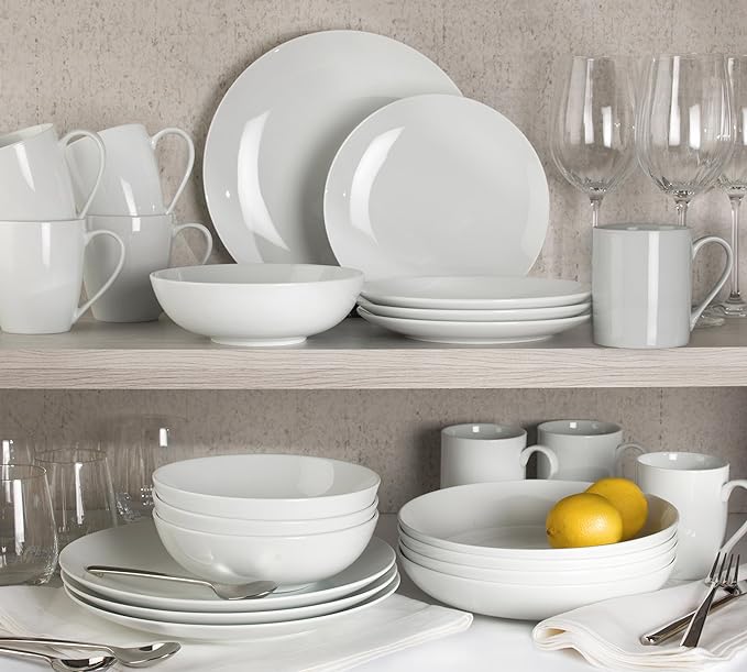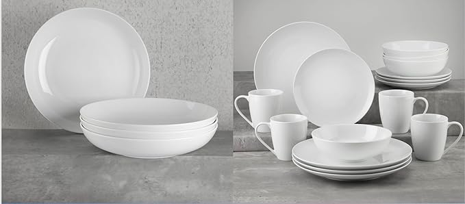 - MODERN MINIMALIST STYLE: Classic white dishes with glossy true white finish; clean lines and timeless design; modern white dinnerware set matches any table décor; elegant presentation for meals