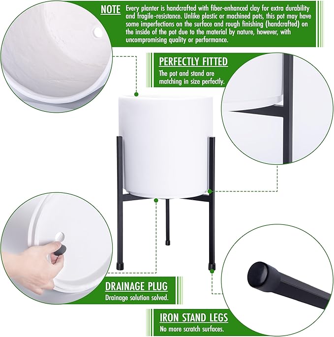 - Simple and Elegant Design: Cylinder-shaped pot is simple and elegant. White color matches well with any plant and decor. Sleek and minimalist stand adds sophistication to your space.