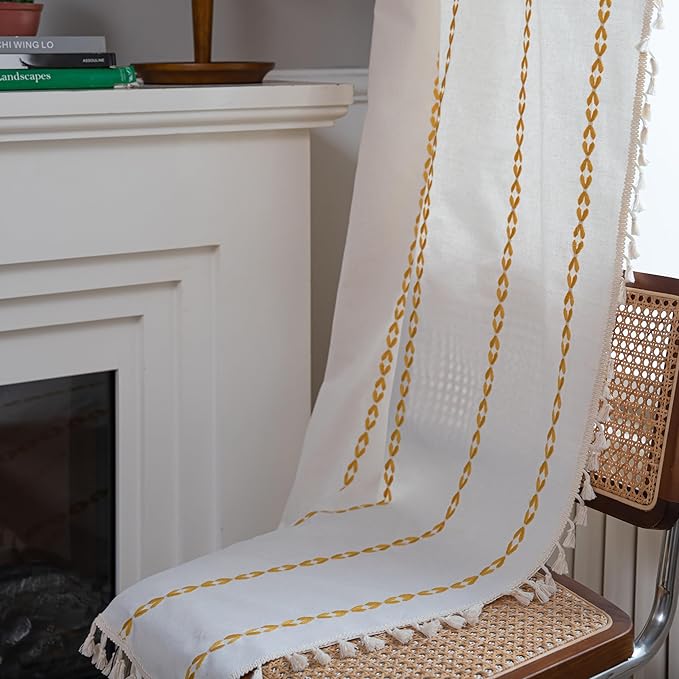 Sutuo Home Boho Curtains for Living Room Bedroom, Semi Blackout Farmhouse Vintage Shabby Chic Tassels Window Treatment Bohemian Embroidery Drape, Rod Pocket 1 Panel 52" W x 96" L, White and Gold