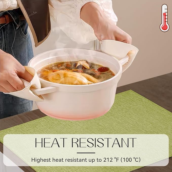 - THICKENED AND HEAT-RESISTANT: Our placemats feature a double-layered faux linen fabric which is heat-resistant up to 220°F (100°C) . They will prevent hot dishes, stains, and scratches from damaging your tables or furniture.