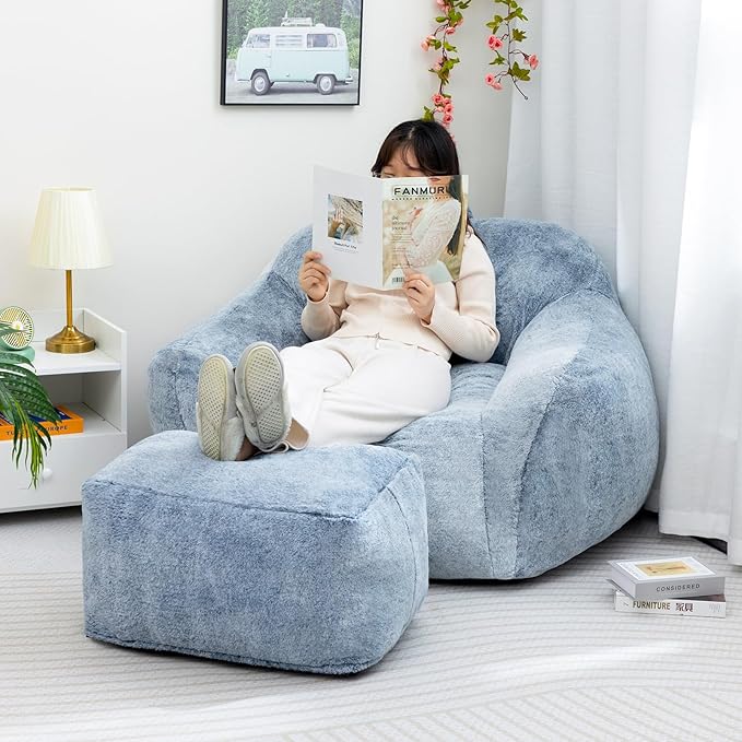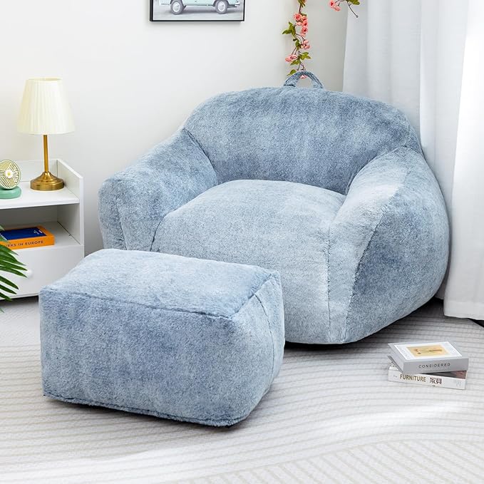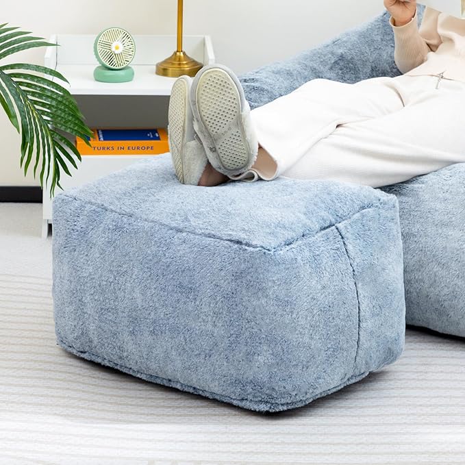 HollyHOME 15"(H) Bean Bag Ottoman Pouf, 6.6LB Memory Foam Filled Footstool for Sofa, Accent Stuffed Footrest Stool with Washable Cover, Single Footrest Stool for Living Room, Bedroom, Blue&Grey
