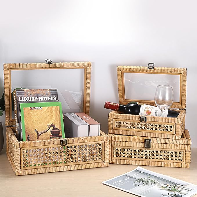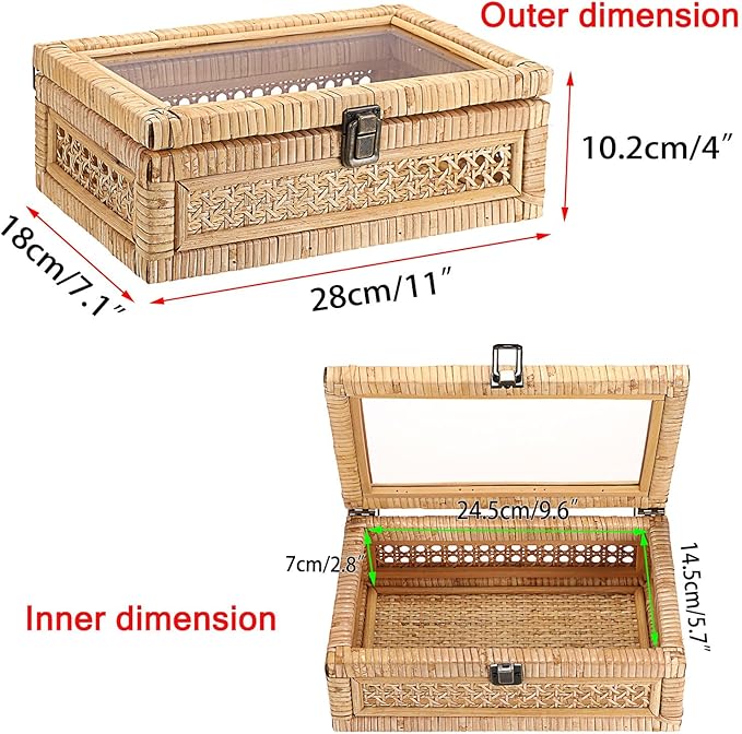 - Rattan Display Box with Clear Lid: The lid of the natural rattan decorative box is made of transparent material, offering a clear view in the box without opening the lid, protect the contents of the box from dust and keep the items clean and stored