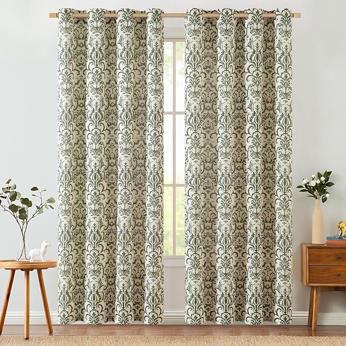 jinchan Linen Curtains for Bedroom Moss Green Damask Patterned Curtains 72 Inches Long for Living Room Light Filtering Vintage Baroque Style Drapes Grommet Window Treatments 2 Panels Set