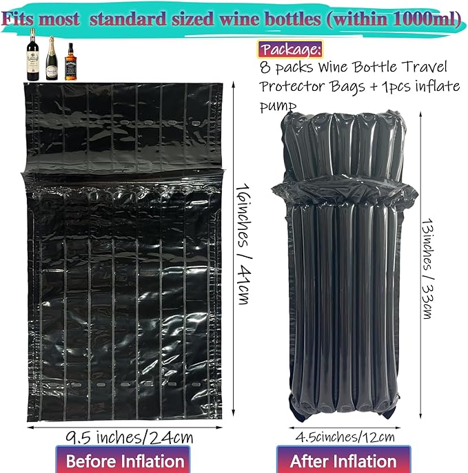 - Package Included: The package include 8pcs of black wine travel protectors and 1pc of free reusable inflator pump. The size before inflation is 9.5x 16 inch, and after inflation is 4.5 x 13 inch. 3.5 inch in diameter. Fit all standard wine bottle.Before inflation, they are flat packed, which can save a lot of space.