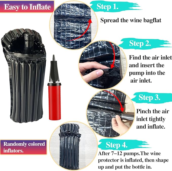 - Easy to Use: Find the right of the bottle travel bag is the airbag inflation port,push the inflator into the inflation port to inflate,take out the inflator directly, and the wine travel bag will seal automatically.They are easy to inflate using the included pump and all of them hold air and pressure.The video on the product page is a great way to help you use wine bags.