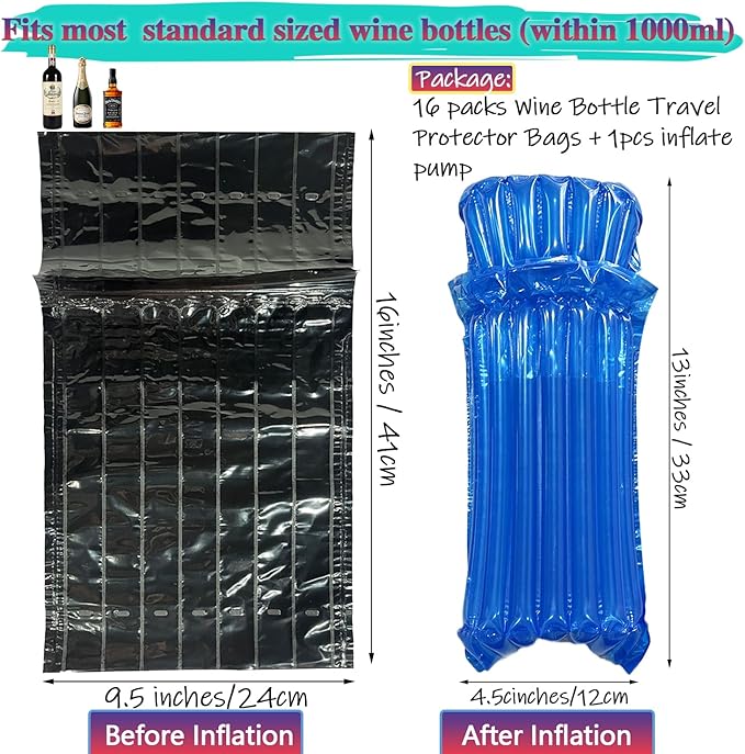 - Package Included: The package include 16pcs of wine travel protectors and 1pc of free reusable inflator pump.(black and blue bags,each color comes 8pcs.) The size before inflation is 9.5x 16 inch, and after inflation is 4.5 x 13 inch. 3.5 inch in diameter. Fit all standard wine bottle.Before inflation, they are flat packed, which can save a lot of space.