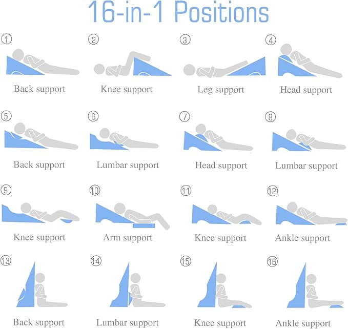 - 16-IN-1 VERSATILE DESIGN: The wedge pillow for sleeping can not only be used while sleeping but also provides a comfortable feeling during leisure activities such as watching TV and reading. It offers 16 different features to choose from and can be adjusted according to individual needs, unlocking more ways to use it. In addition, our pillows are also ISPA certified and are rigorously tested in terms of quality and performance.
