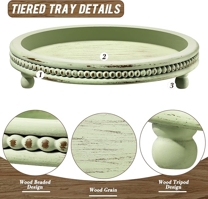 KULEDM Handmade Wooden Decorative Tray, Small Beaded Coffee Table Tray Decor, Sage Round Serving Tray for Coffee Table, Dining Room Table Entryway and Living Room Table