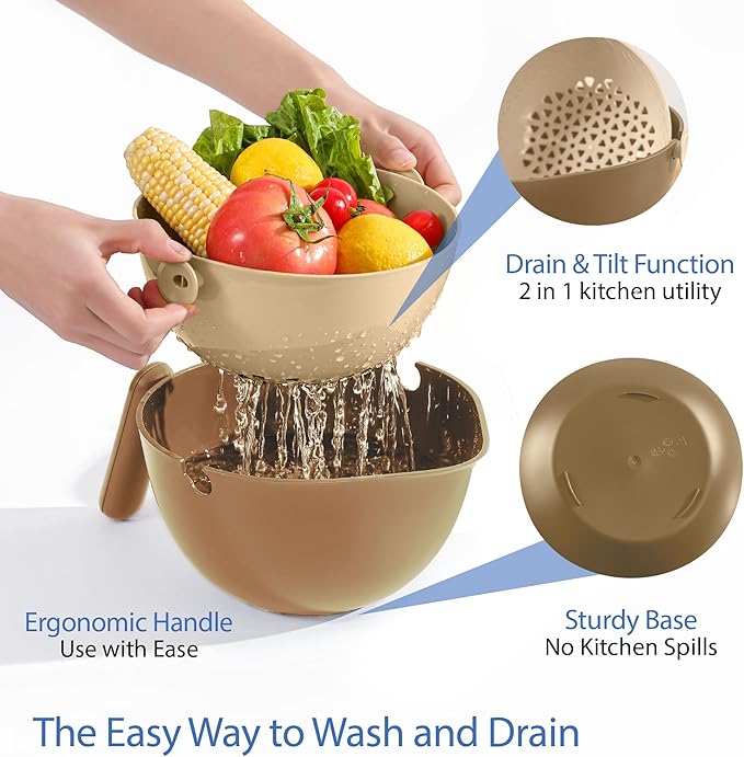 - Versatile Use. Wash, strain, and store! Our multipurpose food strainer and colander bowl set tackles any kitchen tasks. It doubles as a handy fruit washing bowl with strainer or food storage container.