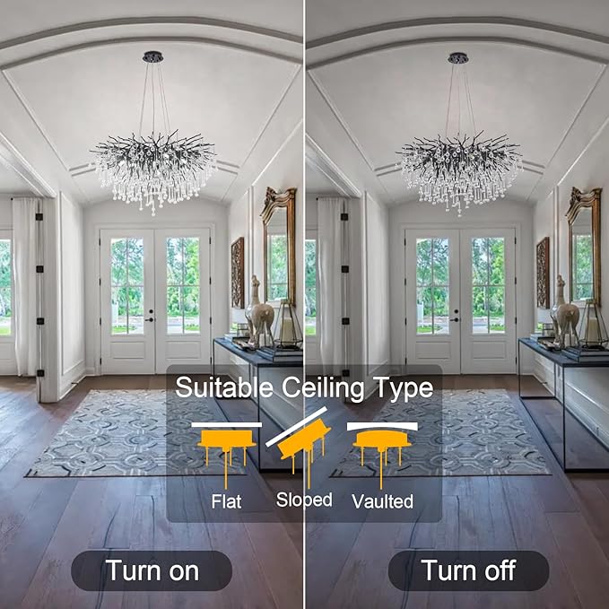 - 【Gorgeous Crystal Chandeliers】The luxury black branches chandelier is like a blooming flower in your home. Shining K9 Crystals Raindrop pendants on the branches.The design of the Round chandelier is very creative, beautiful and gorgeous, it helped create a luxurious yet vibrant aura in the room.