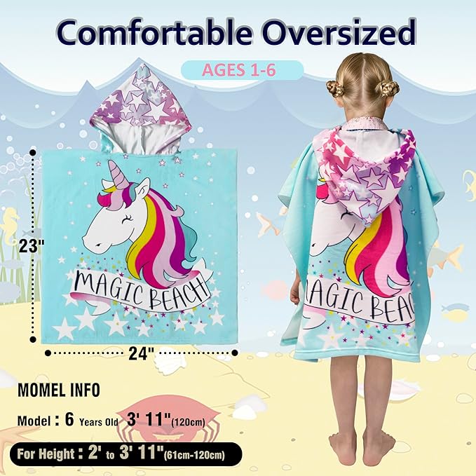 - ?Multi Uses?There's enough room to wrap around and cuddle up in. This poncho beach towels for kids are designed to dry their body or keep warm for kids, girls, and boys. It?s great for after the beach, pool, or bath, as well as to cover up before and after swim lessons. The size is 24"W x 24"L for kids around 27" to 46" height.