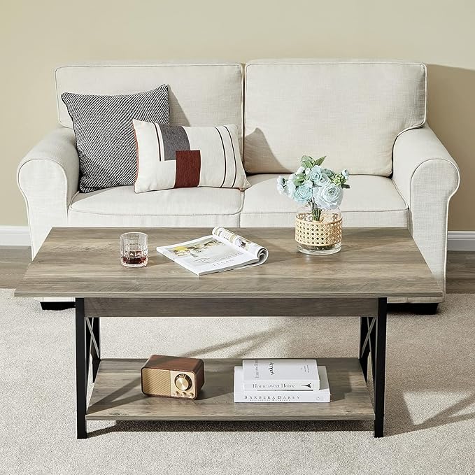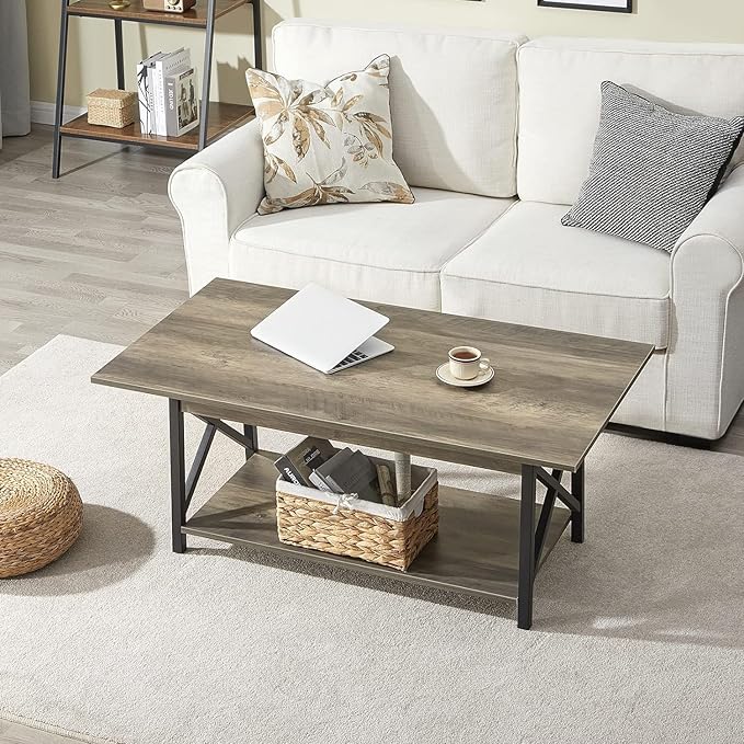 GreenForest Coffee Table with Storage, 39inch Modern 2-Tier Coffee Tables for Living Room, X-Frame Design Farmhouse Coffee Table Space Saving Living Room Small Tables, Easy Assembly, Grey Wash