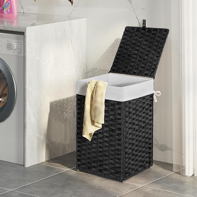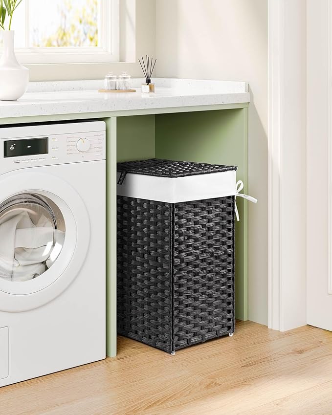 Greenstell Laundry Hamper with Lid, 60L Clothes Hamper with 2 Removable Liner Bags & 2 Mesh Bags, Handwoven Synthetic Rattan Basket, Toys in Bathroom, Bedroom Black