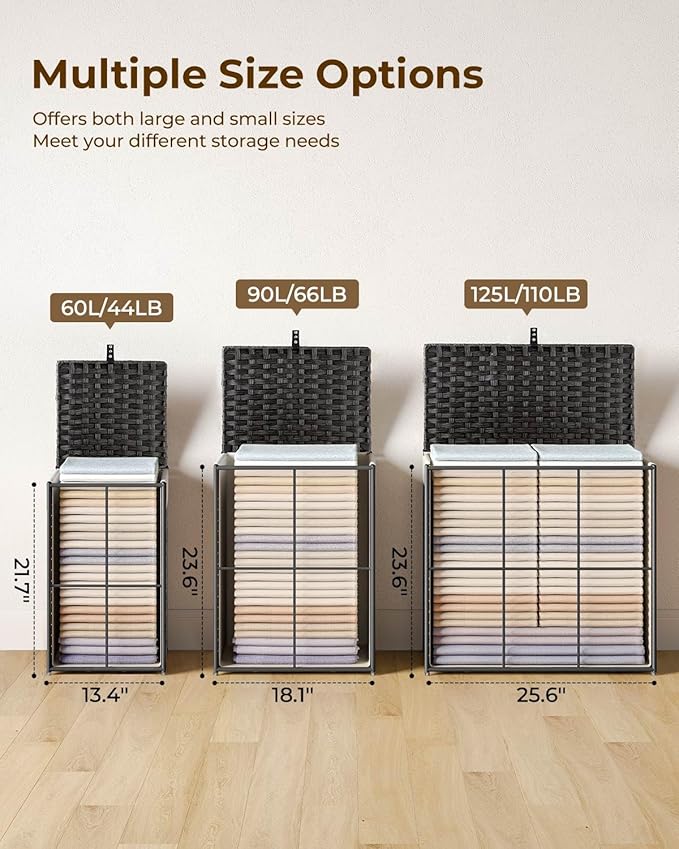 - Easy to assemble, multi-purpose capacity: Convenient tools are equipped for easy installation. There are 3 sizes: 60L size: 13.4 (L) * 13.4 (W) * 21.7 (H) inches, 90L size: 18.1 (L) * 13 (W) * 23.6 (H) inches, 125L sizes: 25.6 (L) * 13 (W) * 23.6 (H) inches. The laundry basket with double-sided Inscribed handle can easily move blankets, towels or daily clothes among different rooms