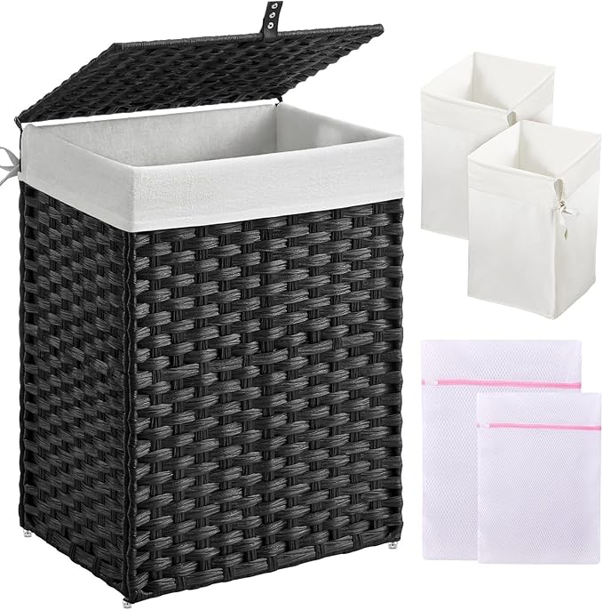 Greenstell Laundry Hamper with Lid, 90L Clothes Hamper with 2 Removable Liner Bags & 2 Mesh Laundry Bags, Handwoven Synthetic Rattan Laundry Basket for Clothes, Toys in Bathroom, Bedroom Black