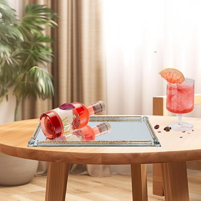 - ELEGANT DESIGN : Our golden decor tray is made of crystal glass, and the four sides of the rectangle are filled with sparkling crystal diamonds. The surface of the tray is mirror, smooth and bright, bling crushed diamond home decor. There are four non-slip rubbers on the bottom to help you prevent scratches on the tabletop.