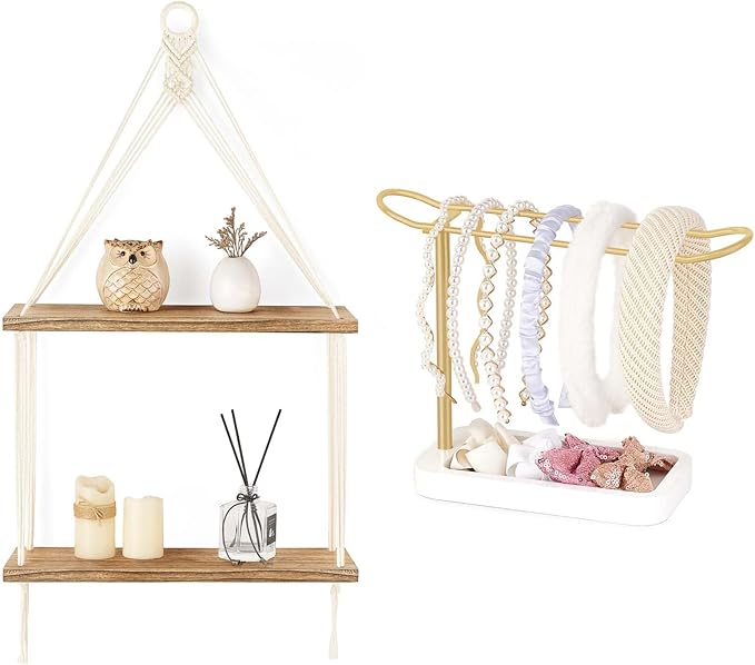 Mkono Macrame Hanging Shelf Boho Wall Decor 2 Tier Handmade Cotton Rope Rustic Wood Floating Shelves Headband Holder Headband Organizer Metal Headband Storage Hair Accessories Organizer