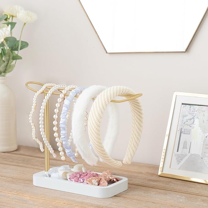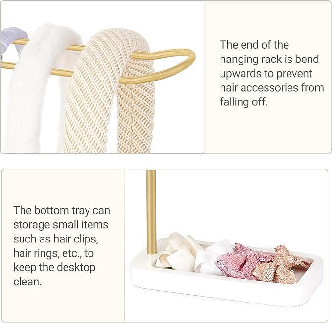 - Unique design: The end of the headband storage organizer is bent upwards to prevent the hair band and hair loop from falling off.Delicate craftsmanship ensures that the surface and edges of the metal rack are smooth and will not damage your hair accessories.The base is designed with a groove,providing additional space for storing hair clips,Hair Ties,and more.
