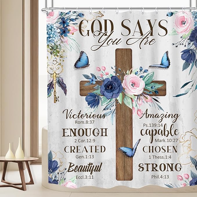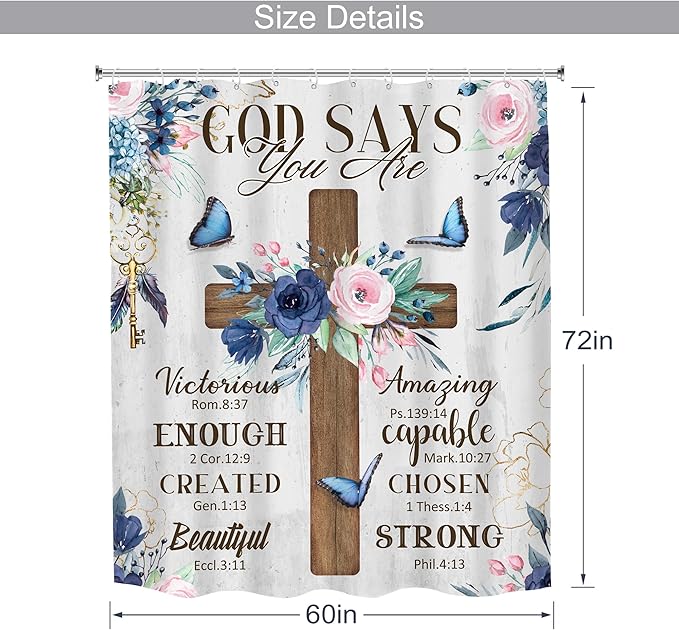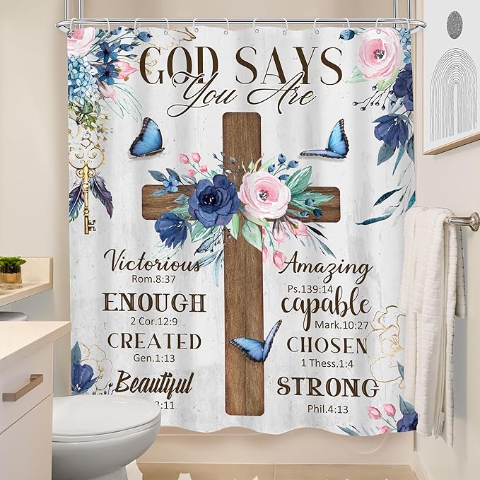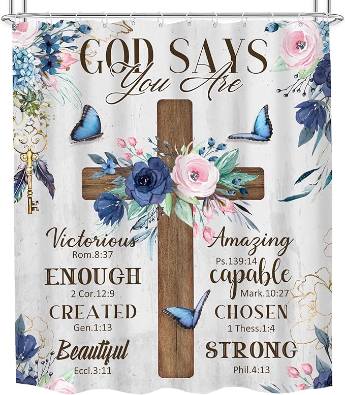 MESHELLY Christian Flower Shower Curtain 60Wx72H Rustic Farmhouse Cross Teal Bible Verse Scriptures Bathroom Curtain Inspiration Quote Bath Curtain Fabric Motivational Bathroom Decor with 12 Hooks
