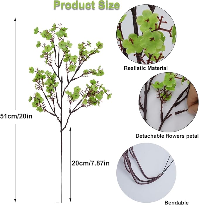 - Product Information: You will get 6 bundles of green flowers per package without vase, Babys Breath artificial flowers is 19.7in/50cm in length, width approx 9.8 inch, fits in a vase about 8 inches tall. Each branch has about 90 flower head. If your vase is shorter, you can bend the length of stem