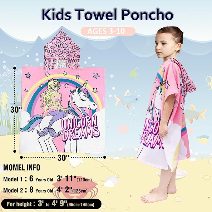 - ?Multi Uses?There's enough room to wrap around and cuddle up in. This poncho beach towels for kids are designed to dry their body or keep warm for kids, girls, and boys. It?s great for after the beach, pool, or bath, as well as to cover up before and after swim lessons. The size is 30??W X 30 "L for kids around 37" to 57" height.