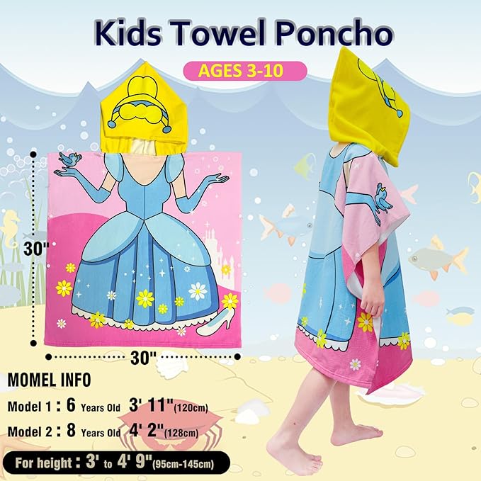 - ?Multi Uses?There's enough room to wrap around and cuddle up in. This poncho beach towels for kids are designed to dry their body or keep warm for kids, girls, and boys. It?s great for after the beach, pool, or bath, as well as to cover up before and after swim lessons. The size is 30??W X 30 "L for kids around 37" to 57" height.