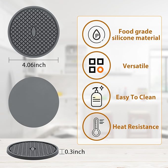 - STOP WORRYING ABOUT SPILLED STAINS ON YOUR COUNTERTOPS - Special diamond-shaped design of the grey silicone coaster is more heat insulation and durability, so don't worry about the stains on the desktop. You will be able to relax and enjoy all the fun moments with your friends and family, protecting all your indoor or outdoor furniture countertops from permanent damage. It can protect your beloved dining table and kitchen countertops from hot water, coffee, and tea stains.