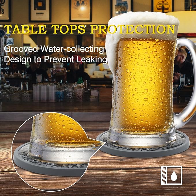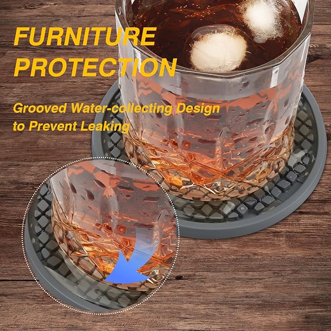 - ANTI-SLIP BOTTOM AND ANTI-STICK TOP DESIGN - Double-sided design, available on both sides, the drink coasters a made of food-grade silicone material. The deep tray grooved pattern holds liquid to prevent leakage; surface ripples promote airflow and prevent the coasters from sticking to the cup. The bottom of the coaster is designed with a unique high slip resistance surface to ensure an excellent table grip for tabletop protection.