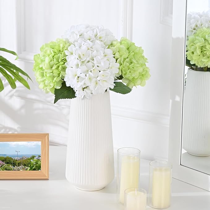 BLEUM CADE 8 Pcs Hydrangea Artificial Flowers with Realistic Stems, 18In Large Fake Flowers, Faux Flower for Home Party Decor Outdoor Wedding Bouquets Table Centerpieces Decoration,White Green