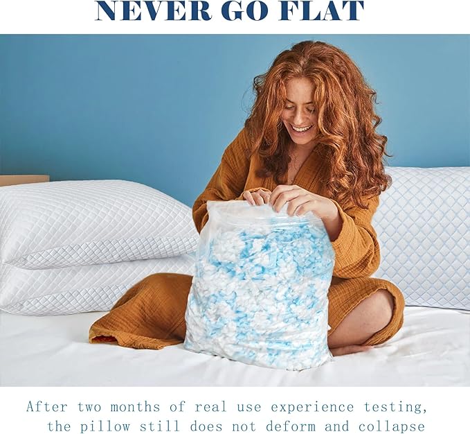 - Never Flat: When you open the package, please pat them well to regain their shape and wait 24 hours before using the pillow to sleep. High quality memory foam shred filling has good resilience and our cooling memory foam pillow will never go flat. You can also put them in the dryer and they'll get fluffy over time