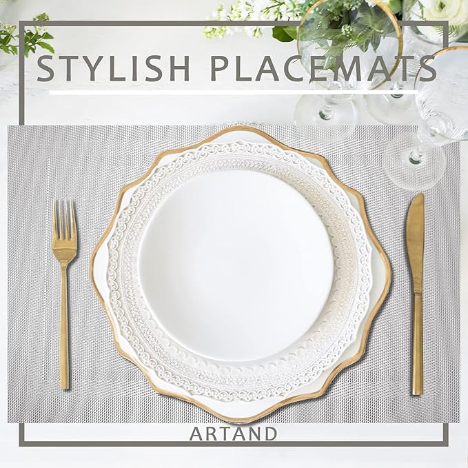 DACHUI Placemats Set of 4, Linen Look Woven Place Mats, Water Resistant, Heat Resistant, Washable, Durable Table Mats (Silver)