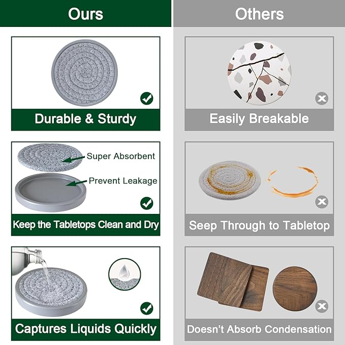 - 🍺5 Pack Coasters for Coffee Table: Original Design & Patented Product, the coasters are woven inserts and wooden base construction that can absorb a larger amount of condensation and ensure moisture does not permeate on the table, keep the table dry to prevent stains or water rings.