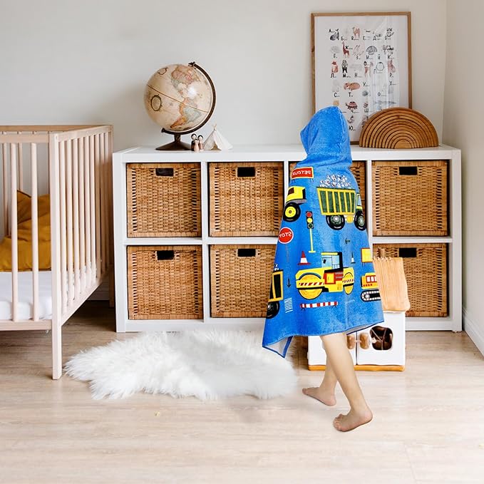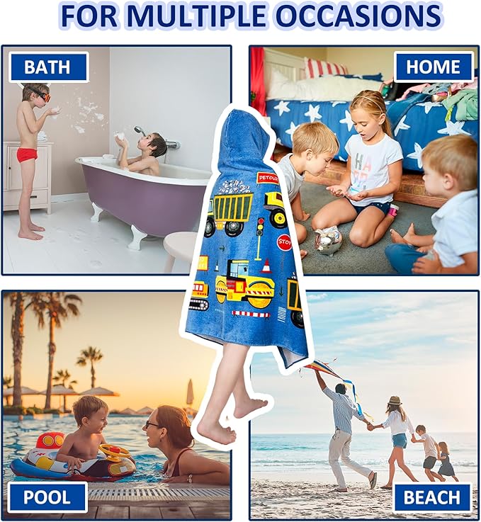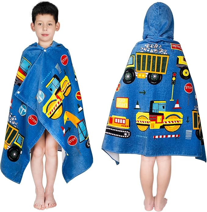 Toddler Bath Towel Hooded - Cotton Kids Beach Towel 30"x50" for Ages 3 to 10, Soft Terry Poncho Towel as Pool Swim Cover Ups for Girls Boys(Construction Site Blue)