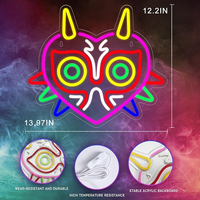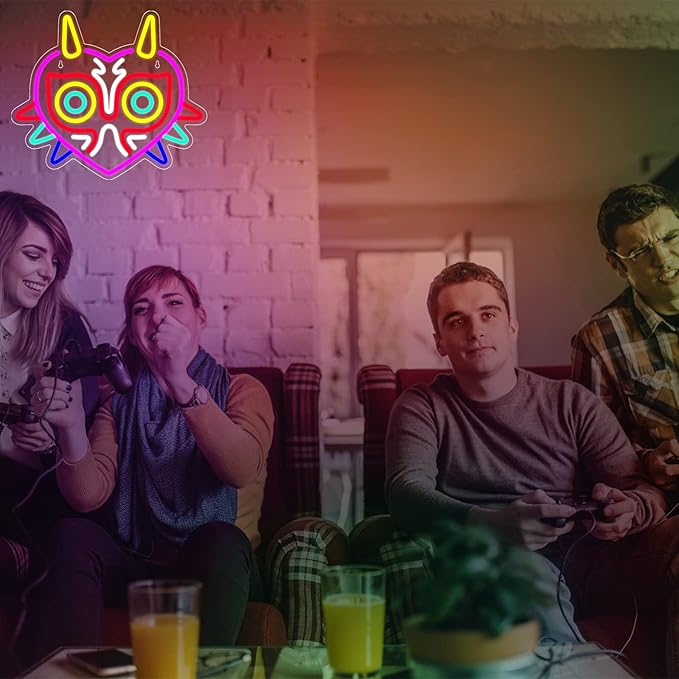 - 🎮 Iconic Majora’s Mask Neon Sign: A must-have for every fan of The Legend of Zelda! This stunningly designed neon sign is the perfect addition to your game room or man cave, adding a touch of nostalgia to your game room decor. Featuring the iconic Majora's Mask design, the neon lights provide eye-catching visuals that will impress your friends and family. Elevate your gaming room with this Zelda fan favorite Majora mask neon sign decor.