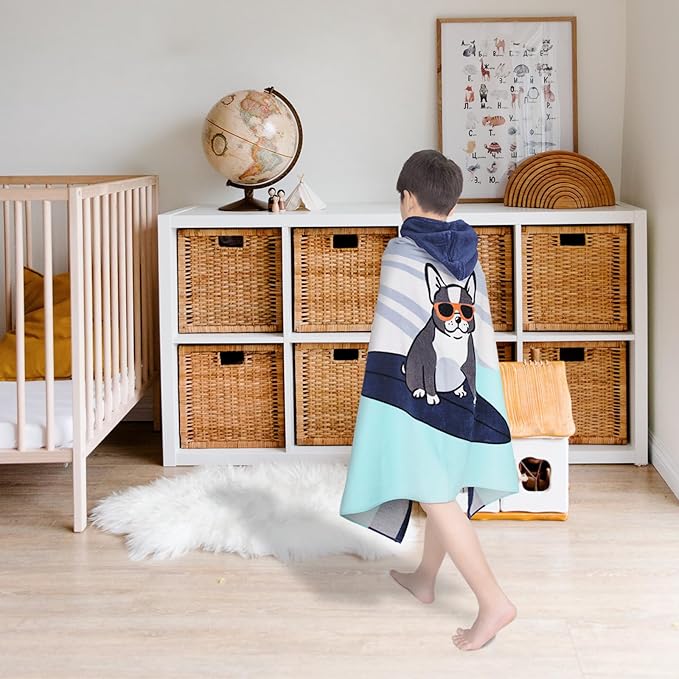 Toddler Bath Towel Hooded - Cotton Kids Beach Towel 30"x50" for Ages 3 to 10, Soft Terry Poncho Towel as Pool Swim Cover Ups for Girls Boys (Bull Dog Surfing)