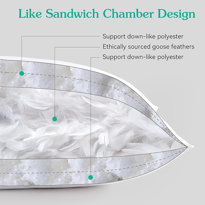 - THREE CHAMBER DESIGN-The pillow has an inner chamber filled with 60%goose feathers, providing support & volume. The two outside chambers are filled with high quality 40%polyester, making them particularly cuddly.