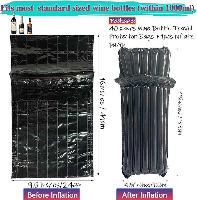 - Package Included: The package include 40pcs of black wine travel protectors and 1pc of free reusable inflator pump. The size before inflation is 9.5x 16 inch, and after inflation is 4.5 x 13 inch. 3.5 inch in diameter. Fit all standard wine bottle.Before inflation, they are flat packed, which can save a lot of space.