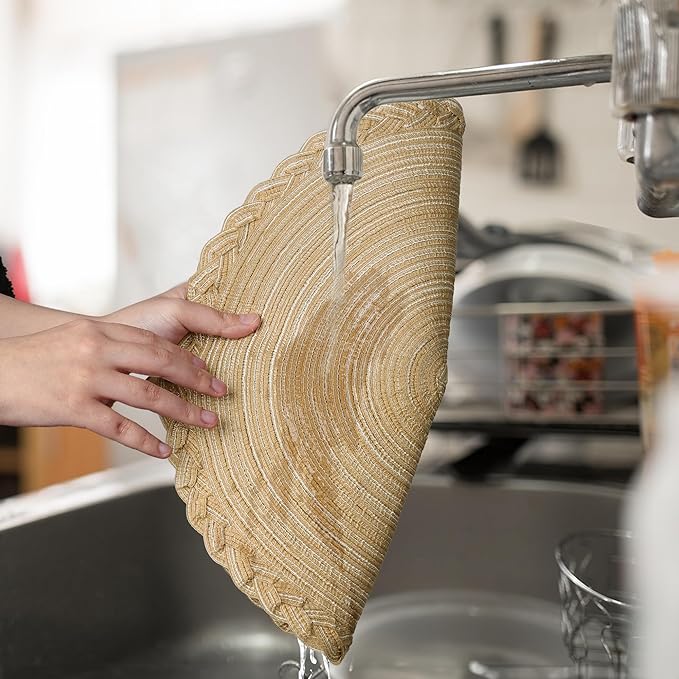 - Quality Material: These dining table mats are woven from a blend of cotton and polyester, combining the softness of cotton with the durability of polyester. The material is safe and long-lasting, presenting a distinctive and elegant gradient texture.