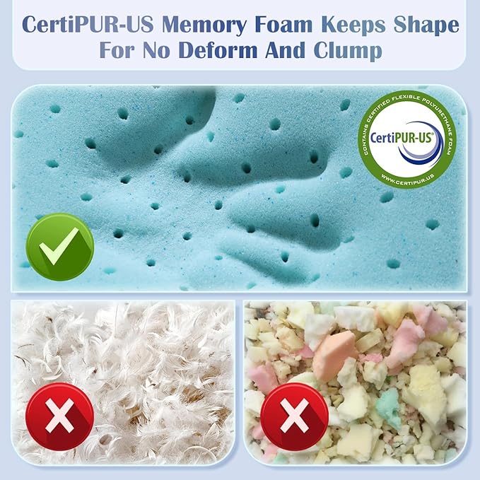 - CERTIPUR-US MEMORY FOAM KEEPS SHAPE FOR NO DEFORM AND CLUMP: Unlike pillows filled with alternative down or shredded memory foam, easy lose its shape, the adjustable memory foam pillow made of CertiPUR-US memory foam can slowly bounce back to its original shape and keep its shape for a long time use, not prone to deform and clump. What’s more, you just need to add or remove the flat pillow’s layer to your ideal height, which is very clean, simple and convenient. Say goodbye to mess adjustments!