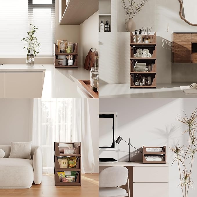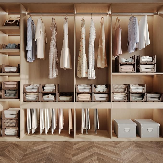 Pinkpum 4 Pack Folding Closet Organizers Storage Box, Stackable Plastic Drawer Basket for Clothing, Stackable Storage Bins Shelf Storage Container for Closet Wardrobe Bedroom Bathroom Office (Toffee)