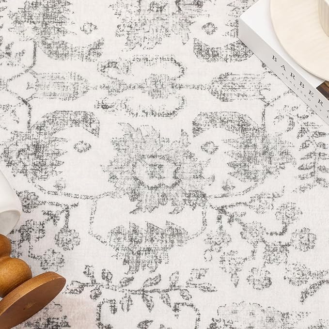 Gray Area Rug 9x12 Machine Washable Large Vintage Living Room Distressed Non Slip Carpet Traditional Indoor Bedroom Grey Retro Floral Accent Throw Rug for Office Kitchen Dining Room