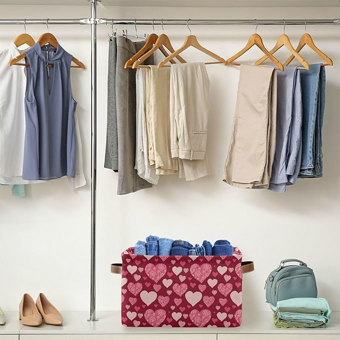Happy Valentine's Day Storage Basket Fabric Kitchen Baskets Valentines Pink Purple Love Heart Open Home Storage Bins Boxes Foldable Organizer Bag Cloth Toy Book Shelf Closet Baskets 16×12×8 Inches
